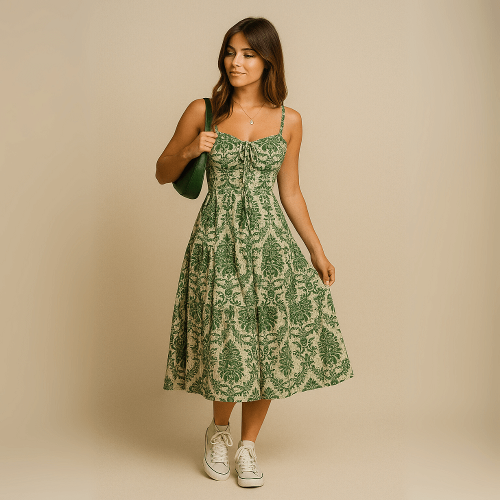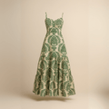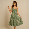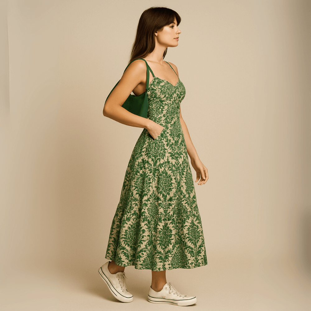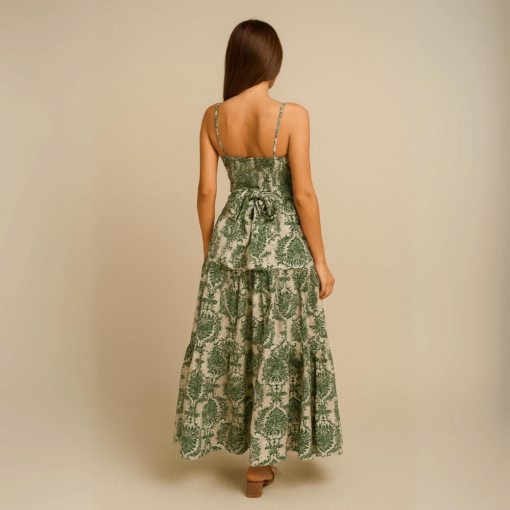 Com estampa clássica em verde sobre fundo cru, ele combina o frescor da natureza com a elegância atemporal. O busto estruturado valoriza a silhueta, enquanto o caimento fluido e a saia em camadas proporcionam leveza e movimento.