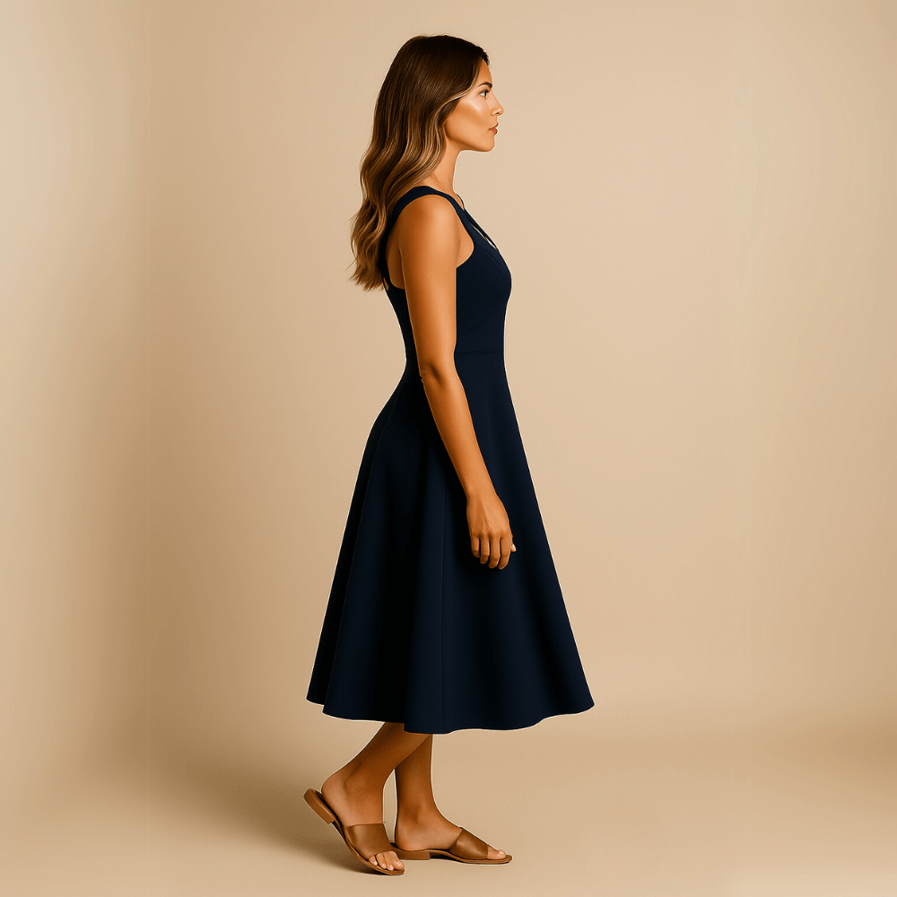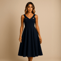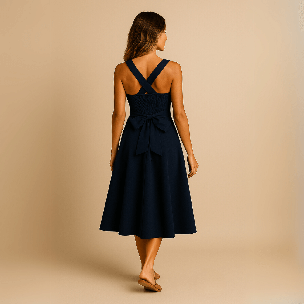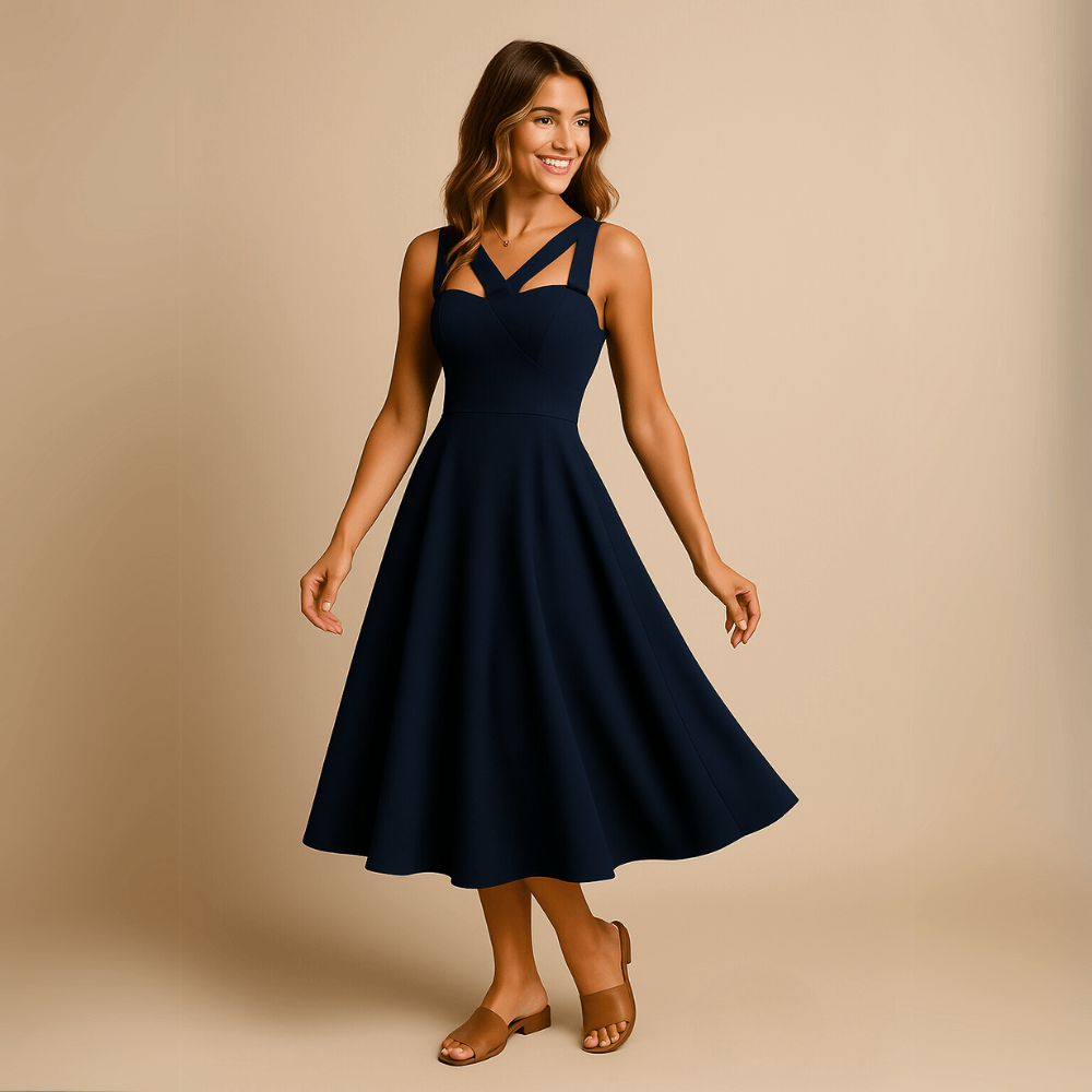 Vestido midi confeccionado em tecido estruturado, com alças largas e detalhe cruzado no decote que valoriza o colo. Possui modelagem acinturada e saia em formato godê, proporcionando movimento e elegância ao caminhar. Clássico e moderno ao mesmo tempo, é a escolha ideal para eventos que pedem um toque de sofisticação com conforto.